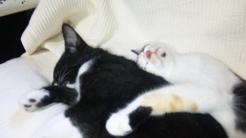 夜私が寝るときにはソファーの上だったり棚の上だったり押入れの中だったり、いろんなところで寝ていたくぅとスーですが、朝目が覚めるといつの間にやってきたのか私の布団にいることが多く、特にくぅは私の胸の上だとかお腹の上だとかで寝ていることもありました。