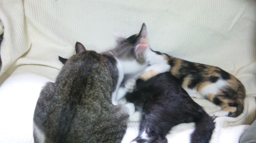 くぅを病院から連れ帰りソファーに寝かせたらすぐに寄ってきてくぅの体を丁寧にずっと舐めつづけた凛とスー。