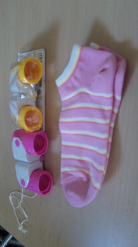 黄色とビンクの靴下に双眼鏡。